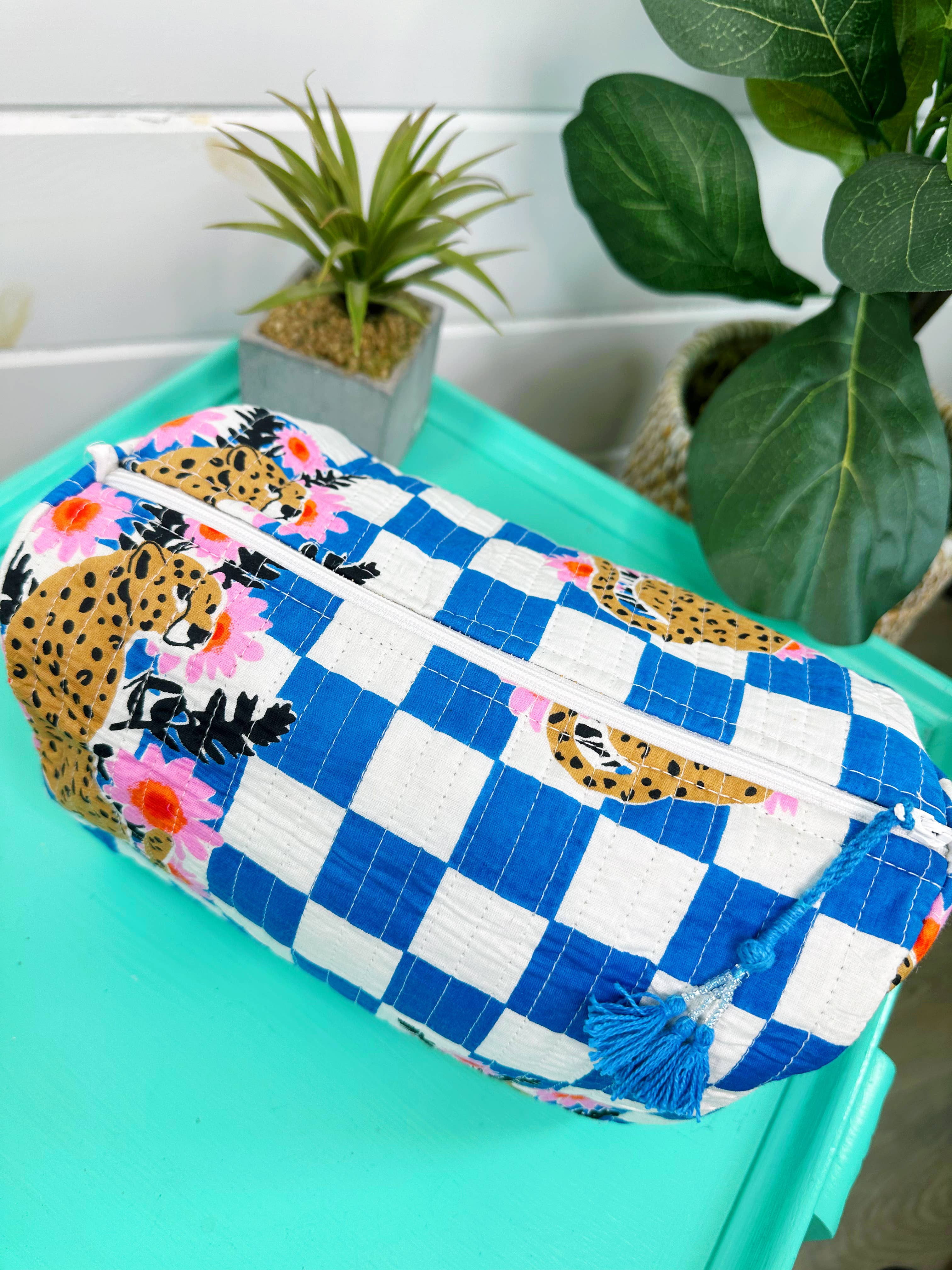 Blue Checkered Jaguar Print Quilted Cosmetics Bags: - Wipeable vinyl style interior with side pockets - Tassel pull tie zipper - Approximate dimensions: 10" x 8" x 6" - Cotton, block printed fabric exterior Perfect for: traveling, cosmetics bag, toiletries, organizing & more! Great to sell for gift shop items, upscale boutiques, birthday gifts, embroidery blanks & more! Our quilted pieces are handmade by Indian artisans. The cotton fabrics are handprinted and proudly sustainably made. Folklore Couture is based in Lake of the Ozarks, Missouri.