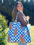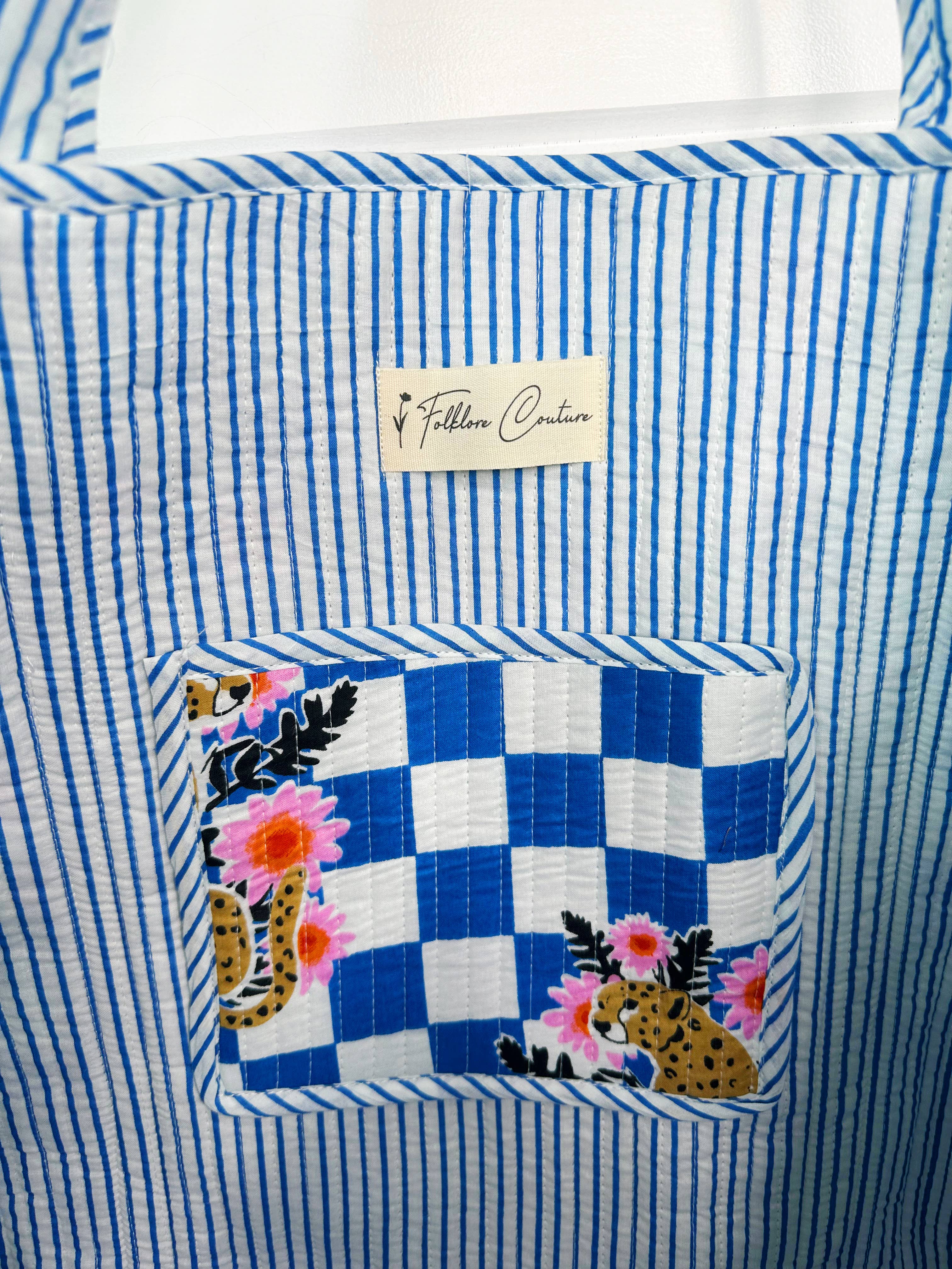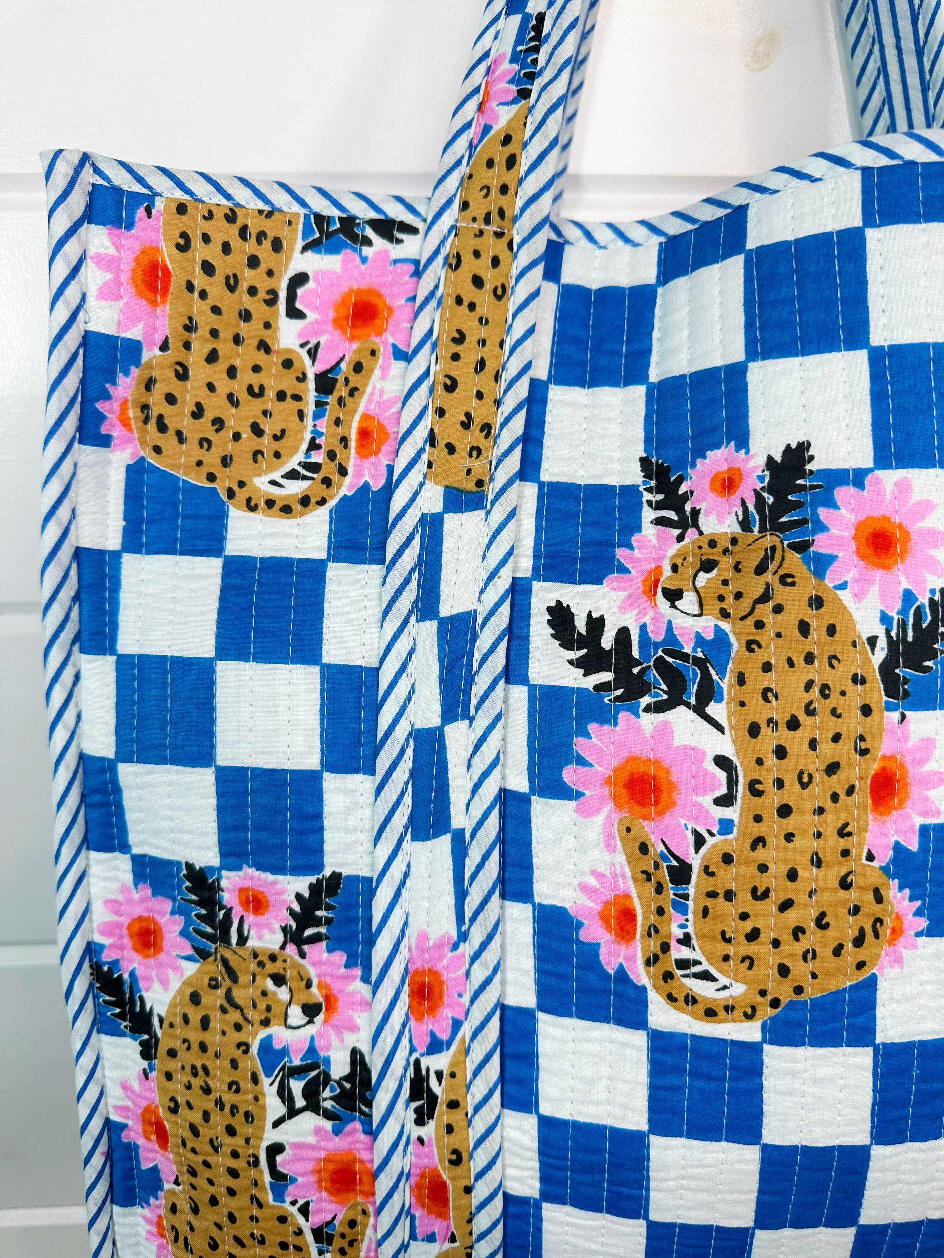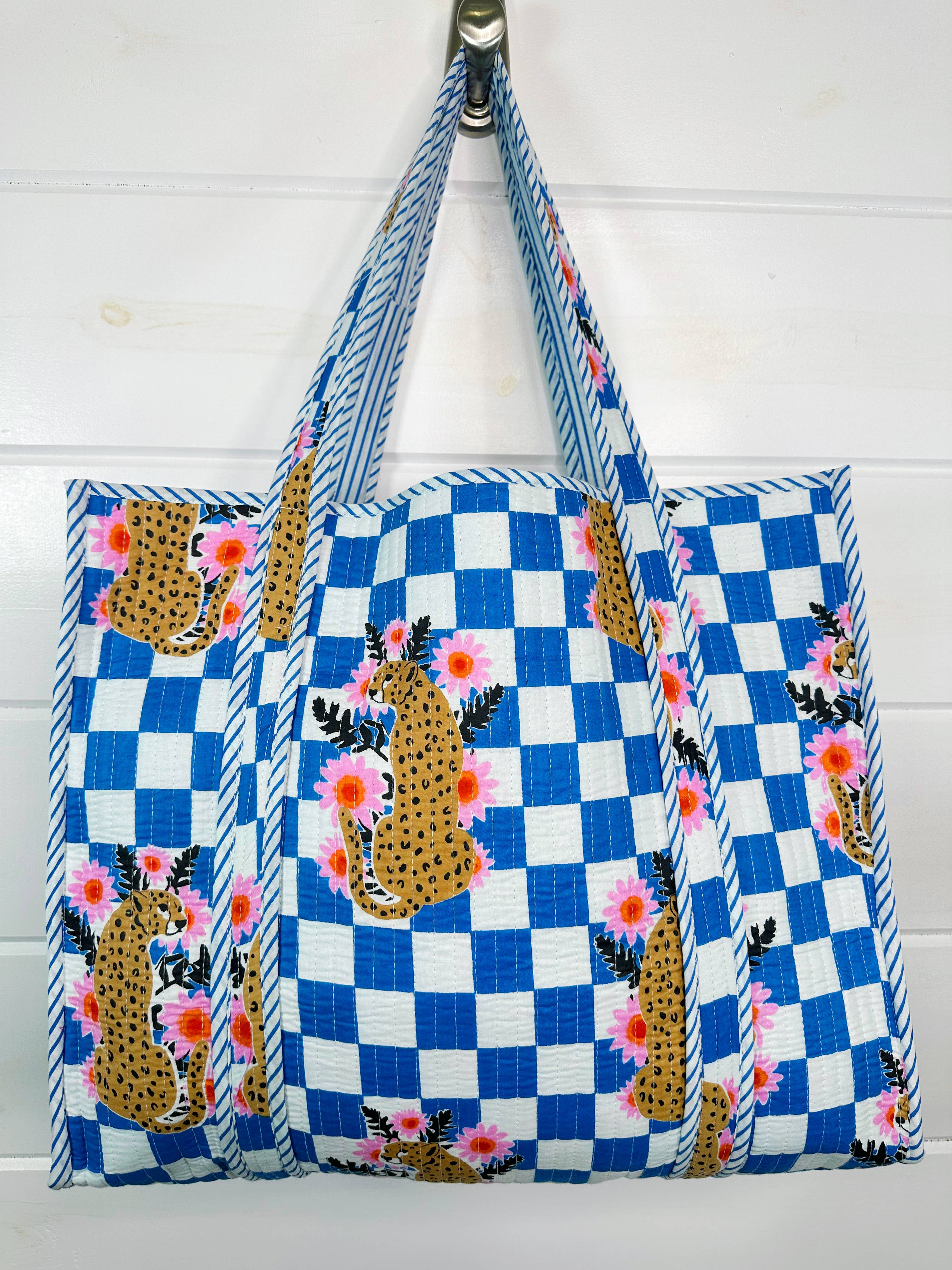 Blue Checkered Jaguar Print Oversized Quilted Tote Bag: - Reversible tote with contrasting interior - Interior pocket - 17.5" x 17.5" - 100% Cotton - Quilted block print fabric Perfect for: market tote, beach tote bag, weekender bag, overnight bag, large shopping tote, travel bag & more! Our quilted pieces are handmade by Indian artisans. The cotton fabrics are handprinted and proudly sustainably made. Folklore Couture is based in Lake of the Ozarks, Missouri. With block printed fabrics, there may be some variations and print placement may vary by bag. Handmade in small batches, prints are very limited.