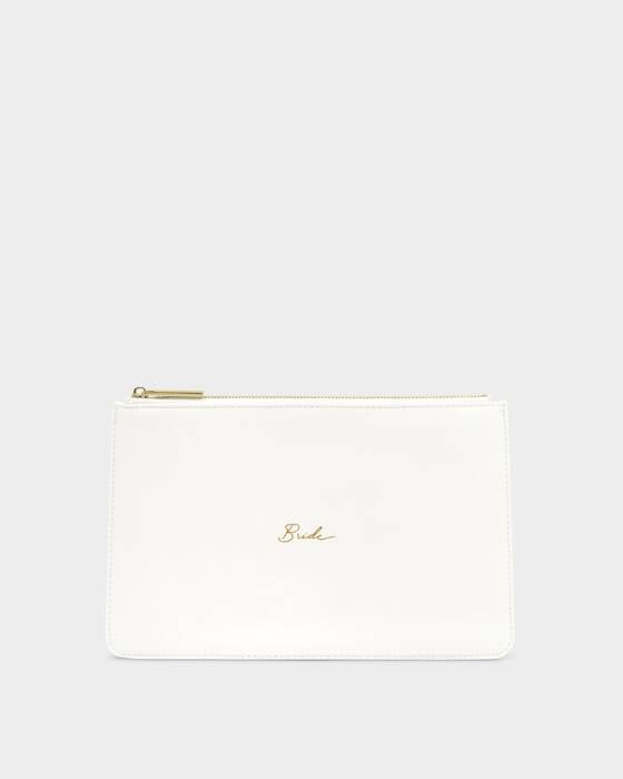 Our Bridal Sentiment Pouch in White is the ideal accessory for big-day celebrations. Carefully designed with soft vegan leather, this pouch adds a touch of elegance to every wedding guest's attire as they toast to the couple's happily ever after. Adorned with the gleaming stamped sentiment 'Bride', it's a charming reminder of their contribution to the big day. The zip-top closure ensures essentials are securely tucked away, while the lightweight design guarantees effortless carrying.
