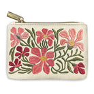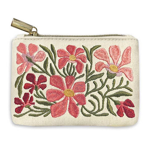 Embroidered canvas pouch with lining and gold metal zipper pull. 5" x 3.5"