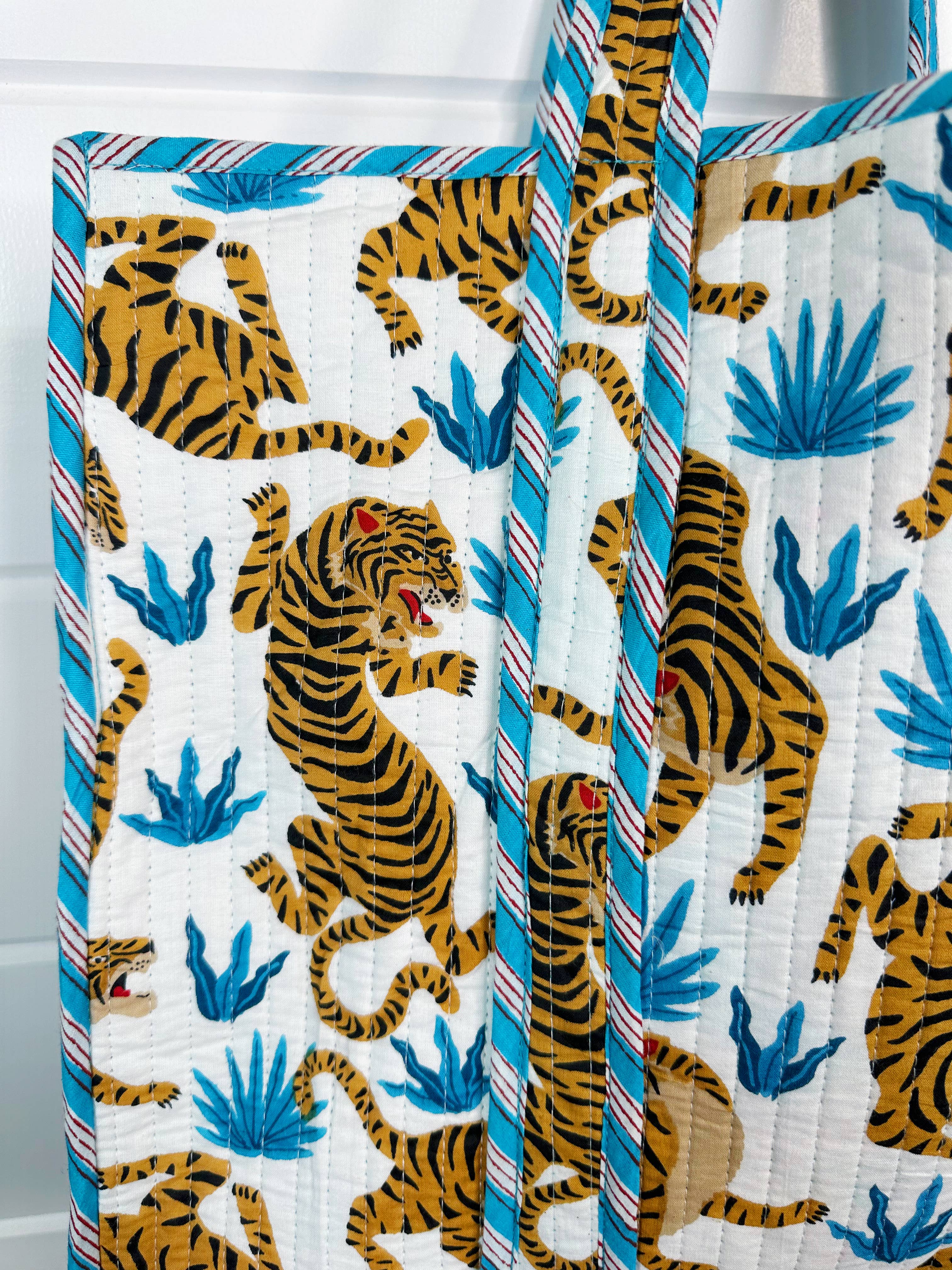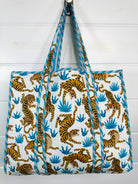 White and Blue Tiger Print Oversized Quilted Tote Bag: - Reversible tote with contrasting interior - Interior pocket - 17.5" x 17.5" - 100% Cotton - Quilted block print fabric Perfect for: market tote, summer beach bag, weekender bag, overnight bag, large shopping tote, travel bag & more! Our quilted pieces are handmade by Indian artisans. The cotton fabrics are handprinted and proudly sustainably made. Folklore Couture is based in Lake of the Ozarks, Missouri