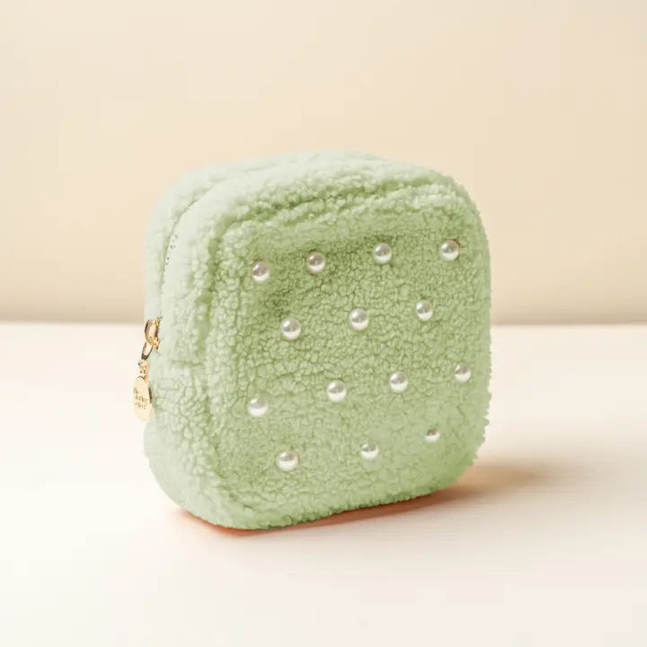 Stay organized in style with our Square Pearl Sage Teddy Pouch. Adorned with delicate pearl details, this versatile pouch can be thrown in any bag or used independently. It is a perfect treat for yourself or as a gift for a loved one.