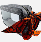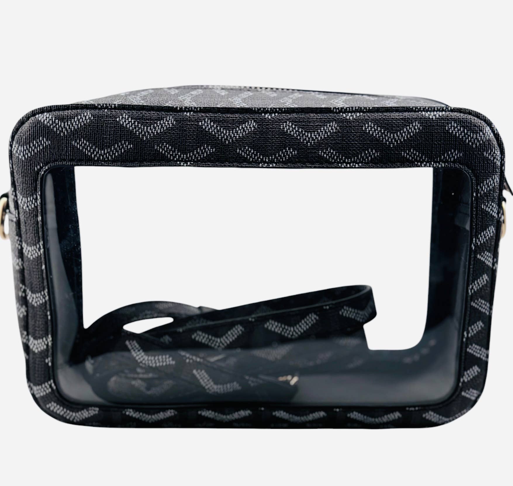 Cross body camera bag style with gold hardware and zipper enclosure. Coated canvas geometric print and clear PVC. Stadium compliant 8 x 6 x 2 inches with a detachable / adjustable strap to 24 inch drop. Available in black and white print.  SCARF NOT INCLUDED