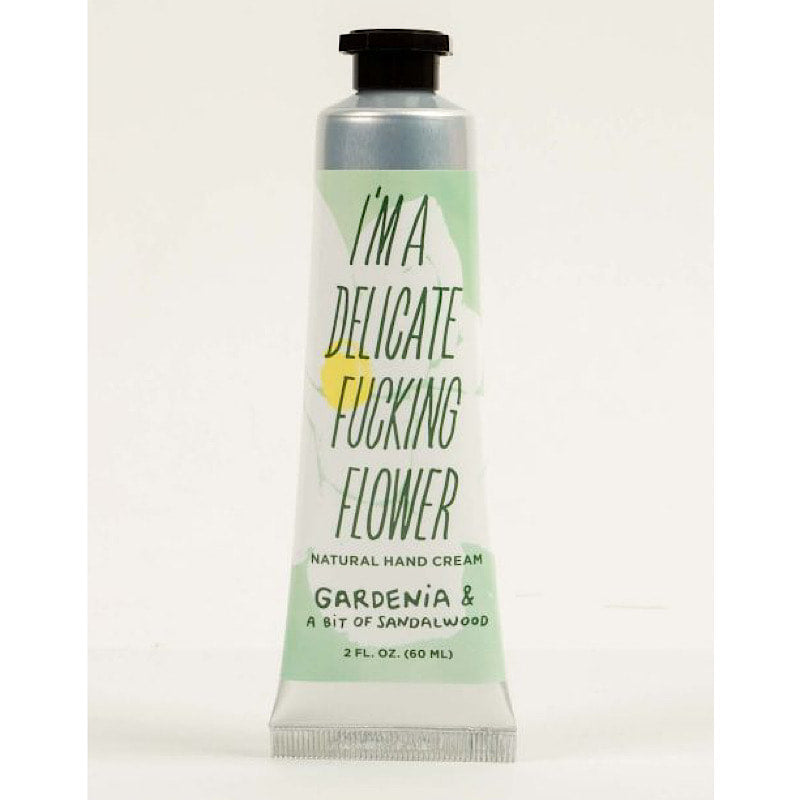 Blue Q: I'M A DELICATE FUCKING FLOWER NATURAL HAND CREAM in GARDENIA & A BIT OF SANDALWOOD