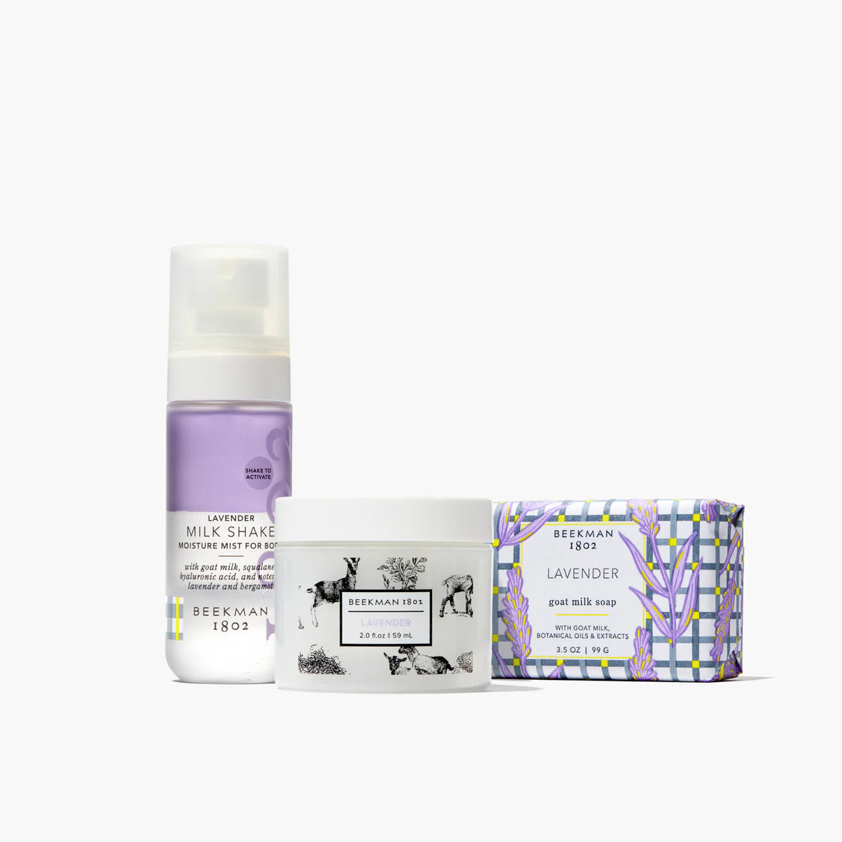 Featuring our NEW Milk Shake Moisture Mist for Body, the first scented body mist infused with real skincare ingredients to deliver lasting hydration and fragrance, without irritation. This set also comes with our beloved Bar Soap and Whipped Body Cream in convenient travel sizes. Infused with vitamin-rich goat milk and scented with freshly picked lavender and Tonka bean, it's like a dreamscape of calm for the skin and the senses.