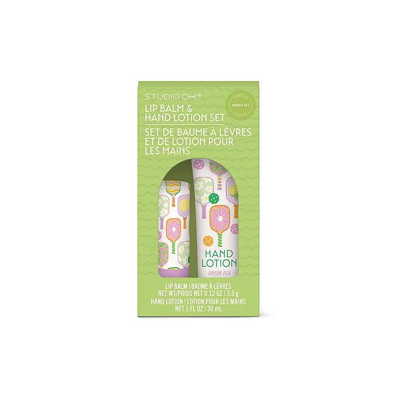 The Lip Balm & Hand Lotion Set from Studio Oh! includes a 1 oz hand cream and lip balm packaged in a clear, reusable pouch. The unscented lip balm helps gently moisturize and smooth dry lips, while the scented hand lotion hydrates hands and cuticles. The two-piece set is artfully designed and perfect for carrying in a handbag or gifting to a friend.