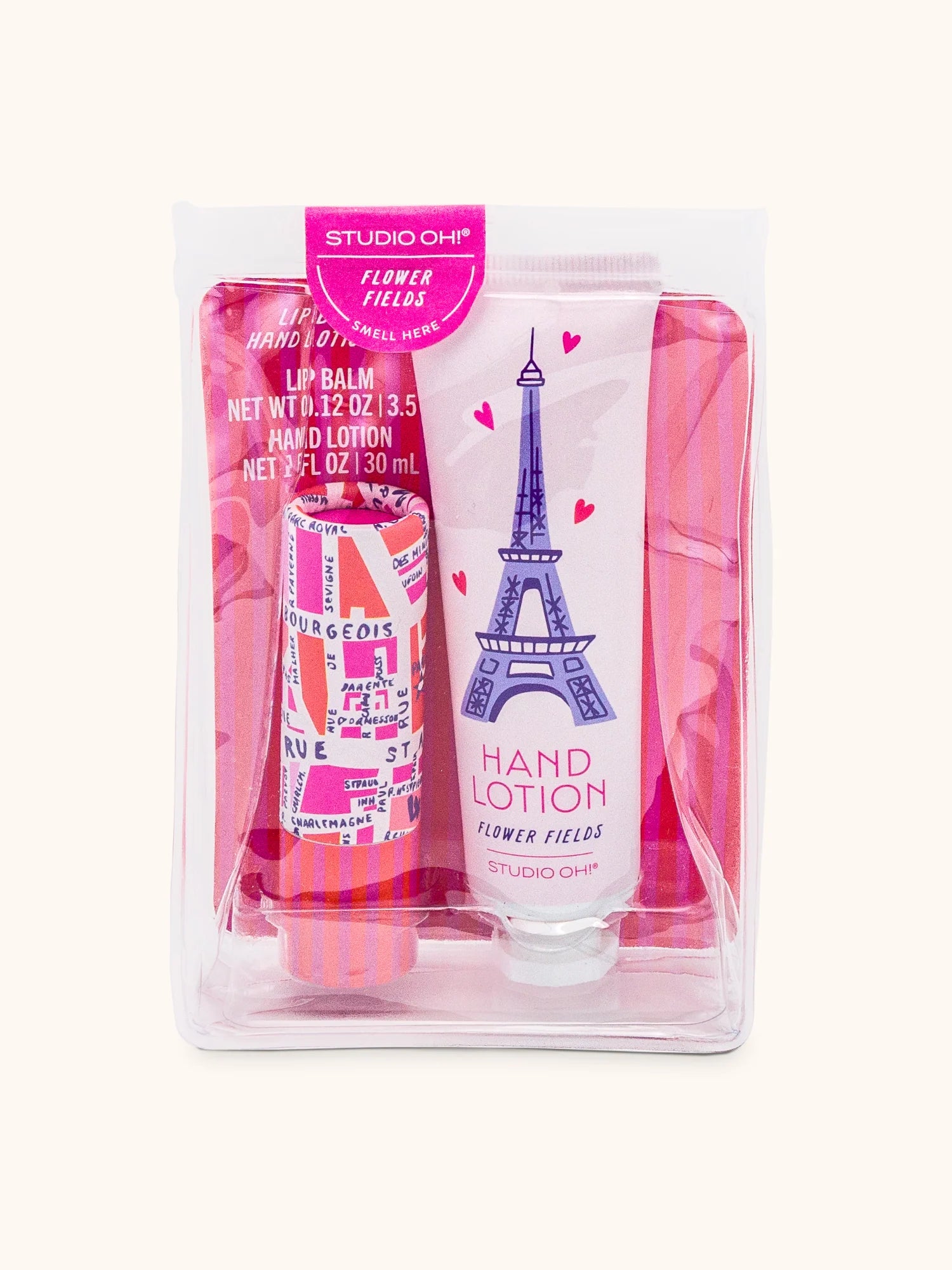 The Lip Balm & Hand Lotion Set from Studio Oh! includes a hand lotion and lip balm packaged in a clear, reusable pouch. The unscented lip balm helps gently moisturize and smooth dry lips, while the scented hand lotion hydrates hands and cuticles. The two-piece set is artfully designed and perfect for carrying in a handbag or gifting to a friend.