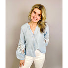 Chambray Raglan Embroidered Cutout Sleeve Blouse