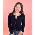 Features: Stretchy ribbed knit fabrication, scoop-neckline, button closures, fitted long-sleeves