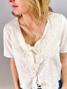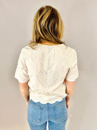 This white heart eyelet top features a tie-up design and snap closure for a secure fit. Perfect for any occasion, this top offers both style and functionality with its versatile design. Stay on-trend with this must-have piece in your wardrobe.