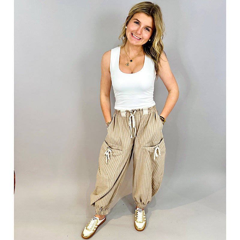 Striped jogger pants featuring an elastic waist with a drawstring cinch closure, two side hip pockets, two open side drawstring pockets, two back pockets, elastic cuffs creating a jogger pant leg with a relaxed silhouette.