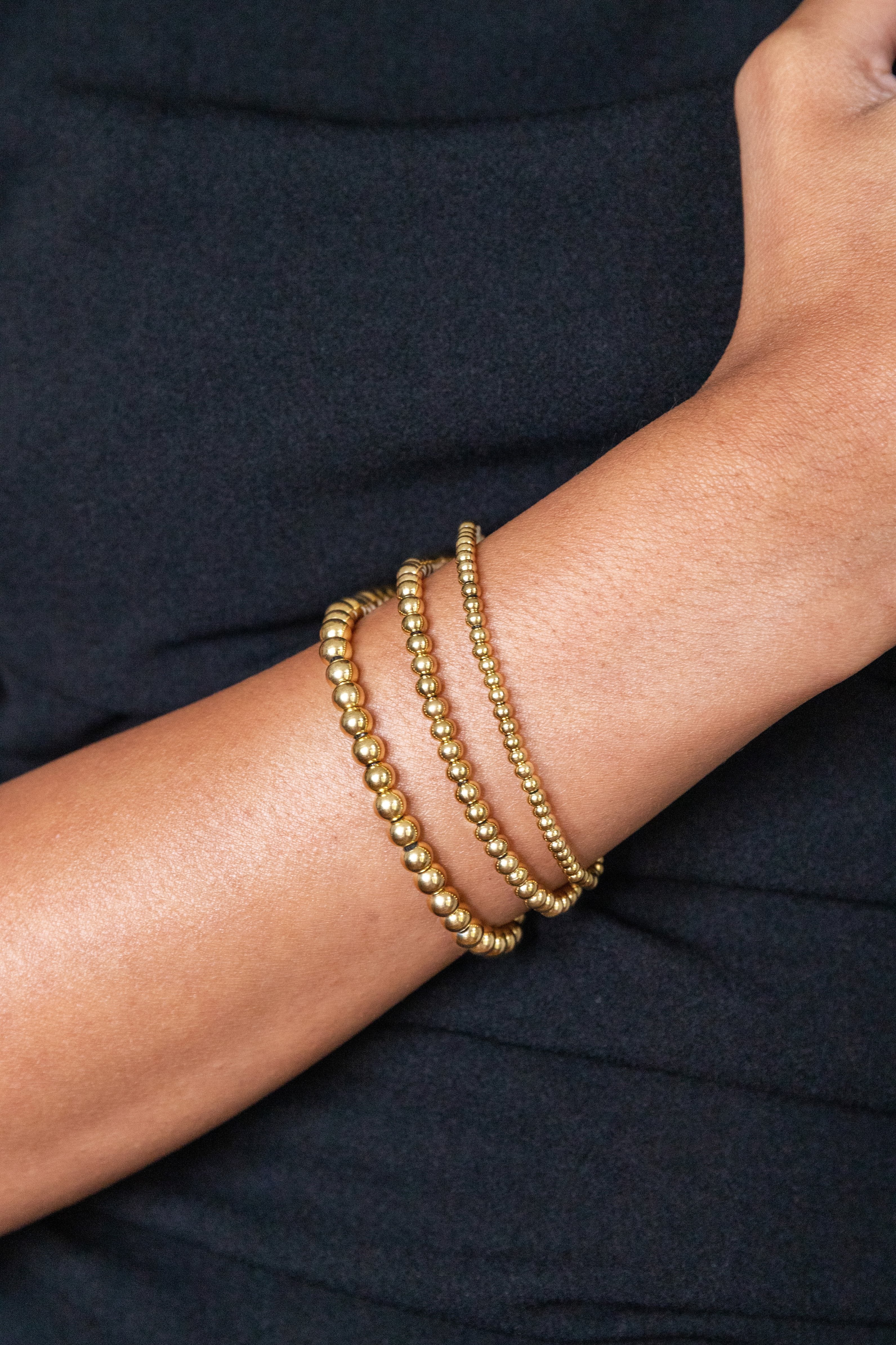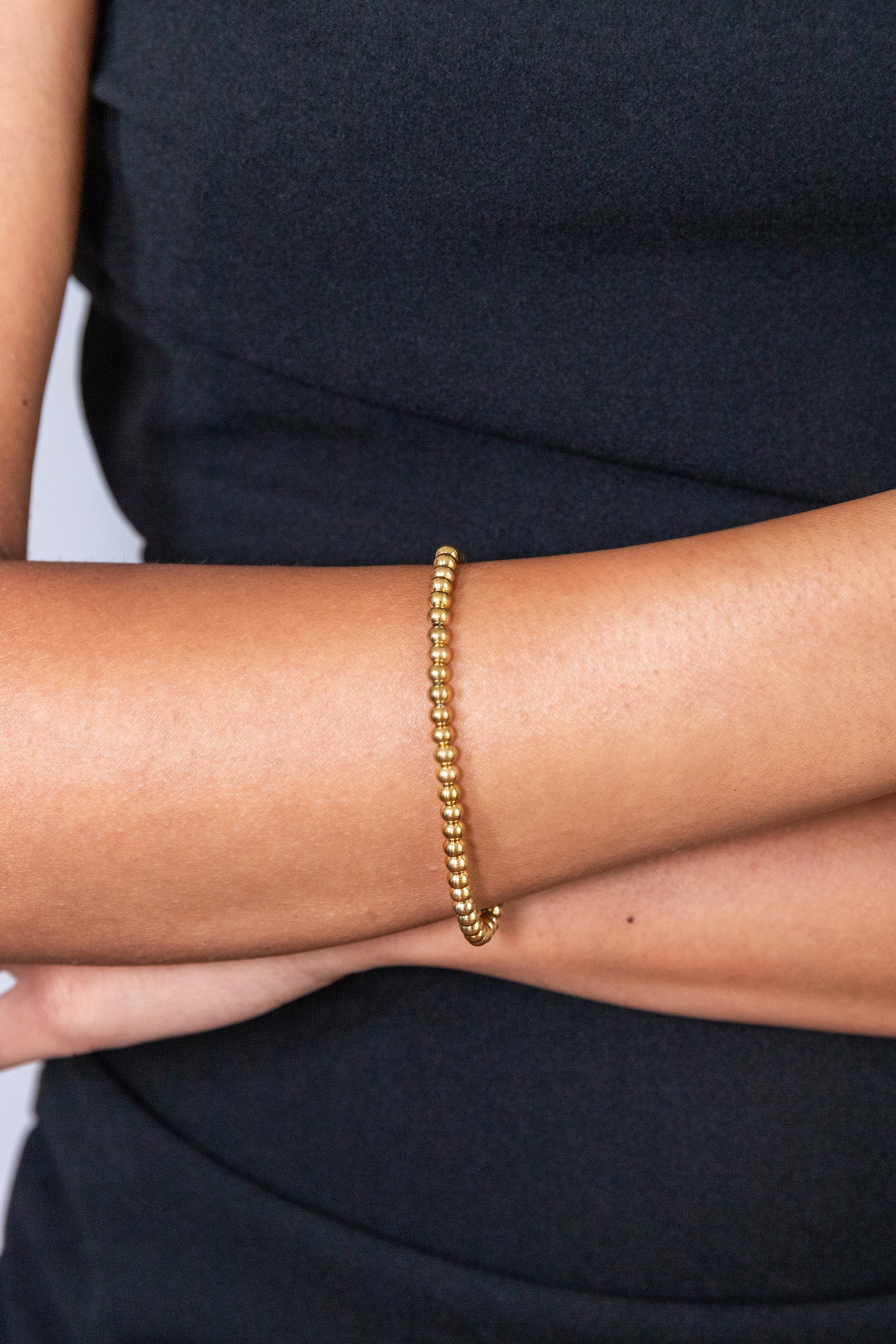 The Crown Bracelet features smooth, round beads strung on durable elastic for a comfortable, effortless fit. Simple yet stylish, this piece is perfect for stacking multiples to add a touch of personality to every ensemble.