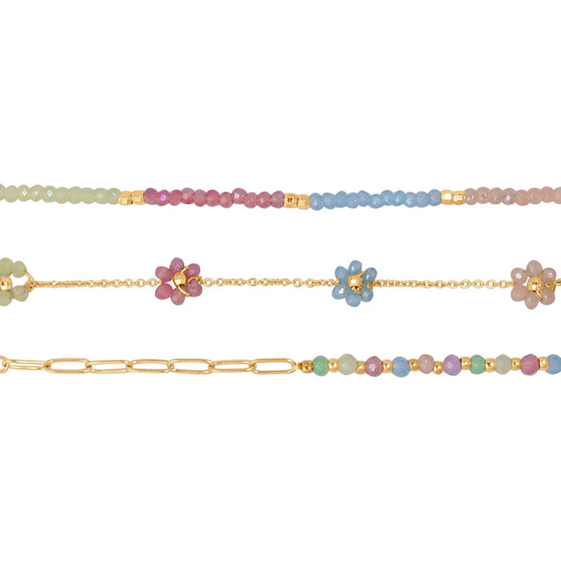 Set of 3 anklets featuring daisy charm, featuring faceted beads and handmade brass chain with colour pop details to add sparkle and elegance to every outfit. At least 50% of the brass we use in the jewellery is recycled from leftover/overhead brass.