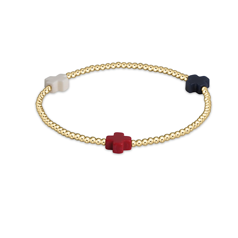 - Made with 2mm, 14kt gold-filled beads and our signature crosses in red, off-wite, and navy.