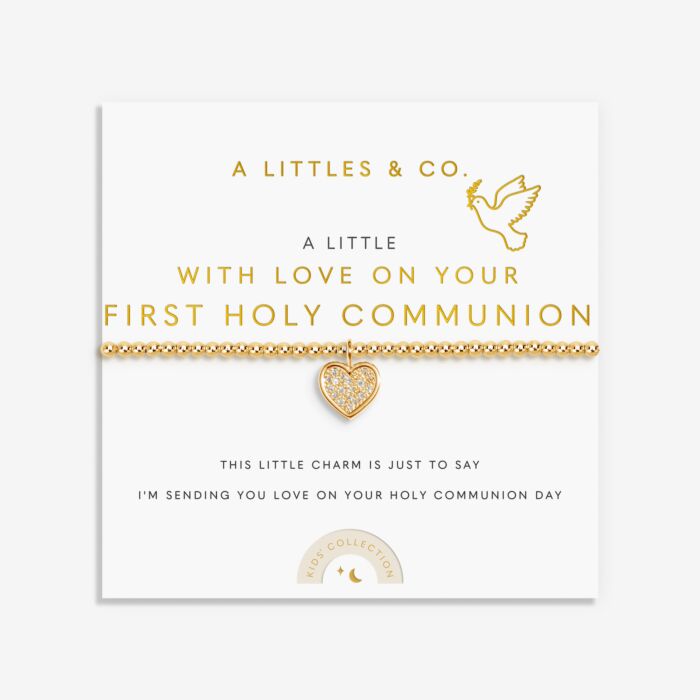 Fill your little one's world with magic and wonder with our adorable collection of Kids' A Littles. Featuring our signature beaded design that ensures a comfortable fit on smaller wrists, the Kids' A Little 'With Love On Your First Holy Communion' Bracelet in Gold-Tone Plating is crowned with a special sparkling heart charm to represent this special occasion. Wrapped around a sentiment-stamped presentation card, illustrated with little doodles, it's sure to make the sweetest addition to your mini-me's stack.