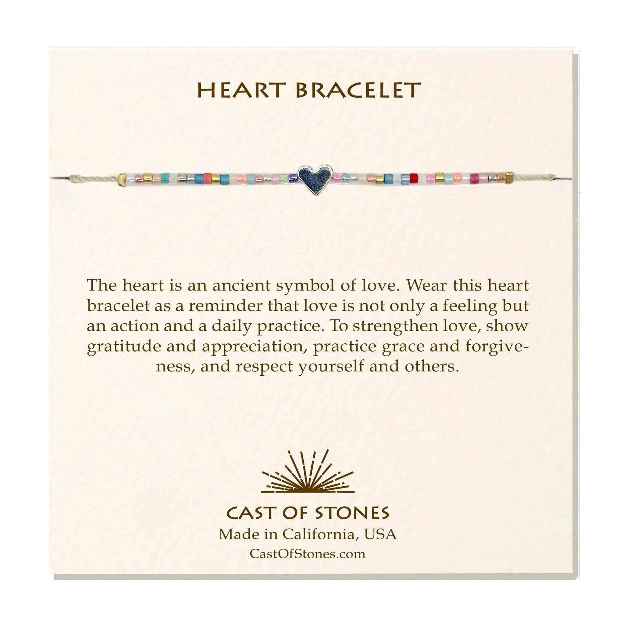 The heart is an ancient symbol of love. Wear this heart bracelet as a reminder that love is not only a feeling but an action and a daily practice. To strengthen love, show gratitude and appreciation, practice grace and forgiveness, and respect yourself and others.