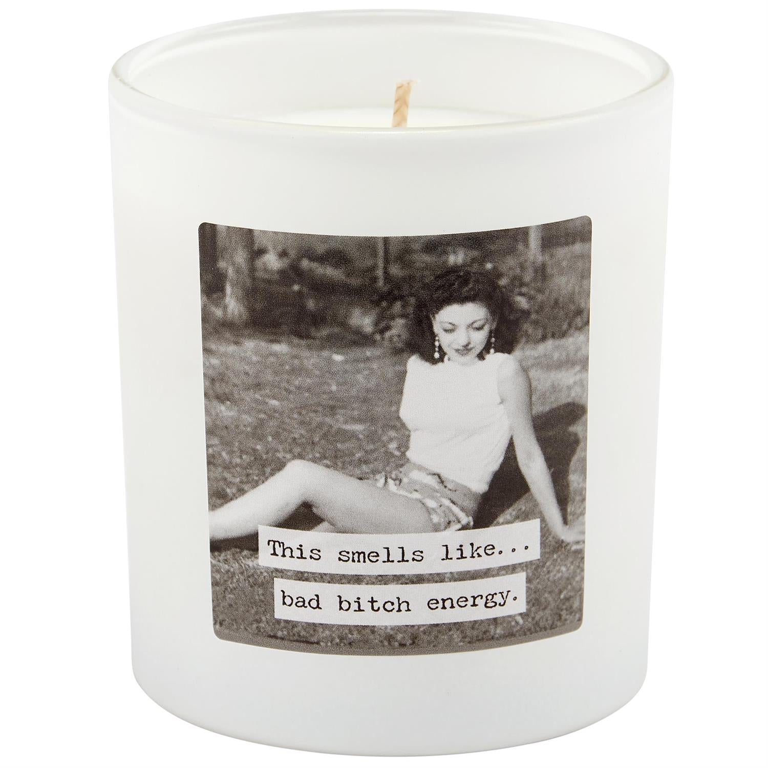 A candle from our Trash Talk By Annie Collection displaying a double-sided design of a vintage black and white photograph on frosted white glass complemented with a humorous sentiment that reads "This Smells Like... Bad Bitch Energy." Candle features soy-based wax and a cotton wick with 35 hours of burn time activating a strong Gin scent. Our Smells Like Bad Energy candle includes a dust cover and plastic lid for protection and polished appearance. A hilarious home accent that is great for everyday gifting.