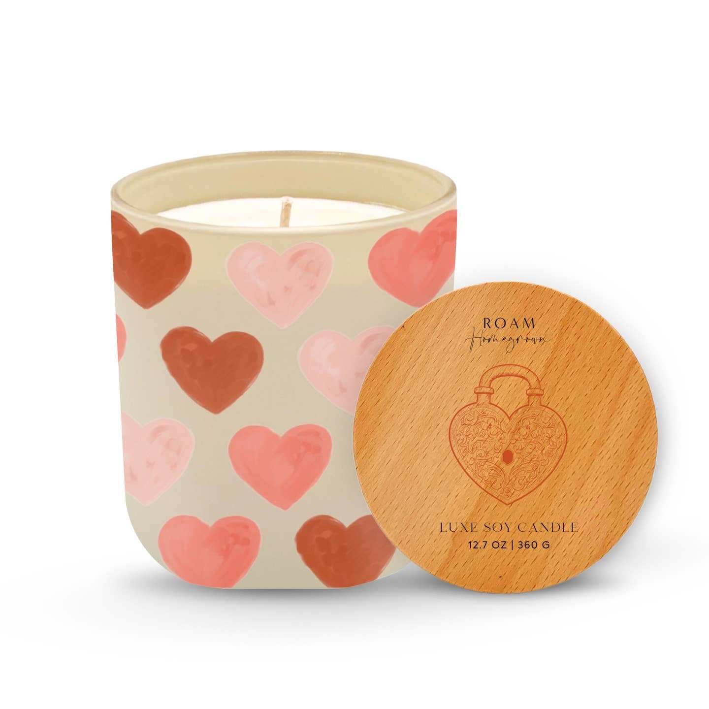 Valentine Hearts: A luxury painted matte glass candle in amber vetiver scent with elegant wood lid. 4.2" H x 3.8" W.
