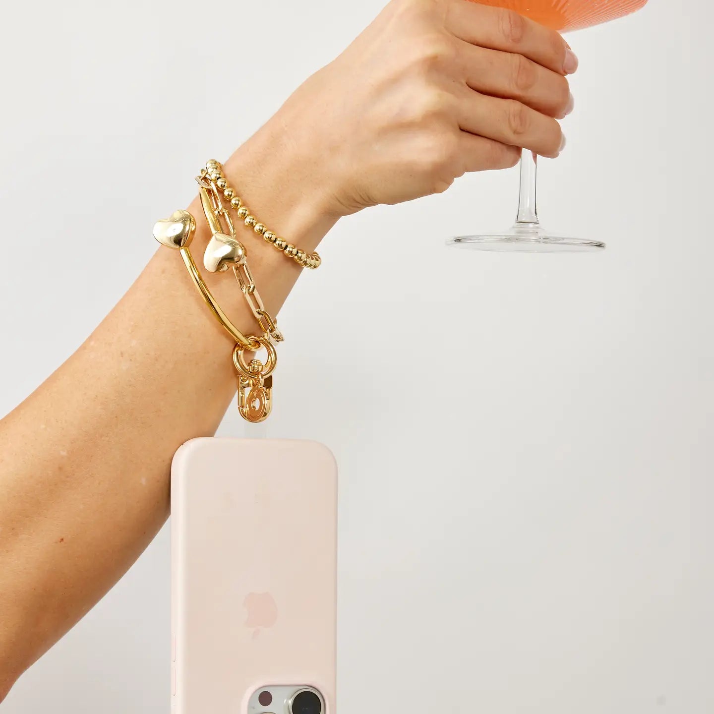 Meet the Big O® Phone Bracelet, a stylish bracelet that doubles as a functional phone wristlet and key ring. With its designer bangle appearance and removable heart caps, the Big O® Bracelet is as stylish as it is practical. Featuring a split ring and Hook Me Up™ Phone Connector, this bracelet effortlessly transforms your phone or wallet into a chic, handsfree wristlet. Say goodbye to juggling your essentials with this innovative phone wristlet and bracelet key ring.