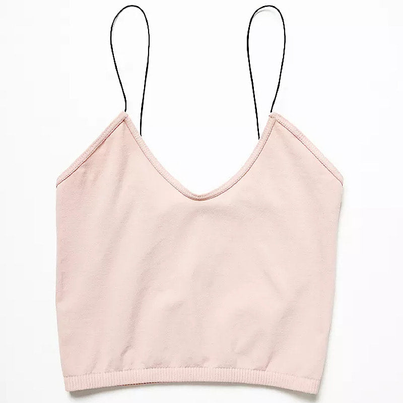 American made from our Signature Seamless fabric, this stretchy brami features elastic straps and a ribbed hem. The straps are black.