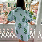 Fresh, playful, and effortlessly polished, this mini dress is a standout choice for warm-weather style. Designed with crisp blue-and-white pinstripes, it's accented by vibrant green floral motifs that add a charming pop of color. The collared neckline and partial button placket give it a tailored feel, while the short puff sleeves with adjustable ties create a soft, feminine silhouette. Crafted from a lightweight, breathable fabric, this dress is as comfortable as it is cute. Side pockets add everyday practicality, and the relaxed fit makes it easy to wear from day to night. Pair it with sandals or espadrilles for a casual daytime look, or dress it up with wedges and statement earrings for brunch, vacations, or outdoor gatherings. This mini dress blends classic stripes with fresh florals for a look that feels timeless yet fun.