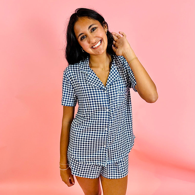 Easygoing and ultra-soft, this pajama set is made from our silky jersey fabric in a playful gingham print. With a relaxed fit, patch pockets, and a rounded hem, along with comfy elastic waist shorts, it’s the kind of outfit you’ll want to lounge in all day long.