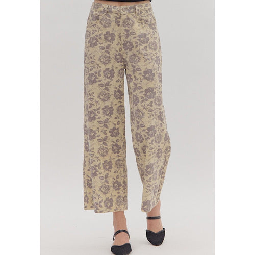 Floral print ankle-length pants. Button fly-front zipper closure. Pockets at sides and back patch pockets. Unlined. Woven. Non-sheer. Lightweight.