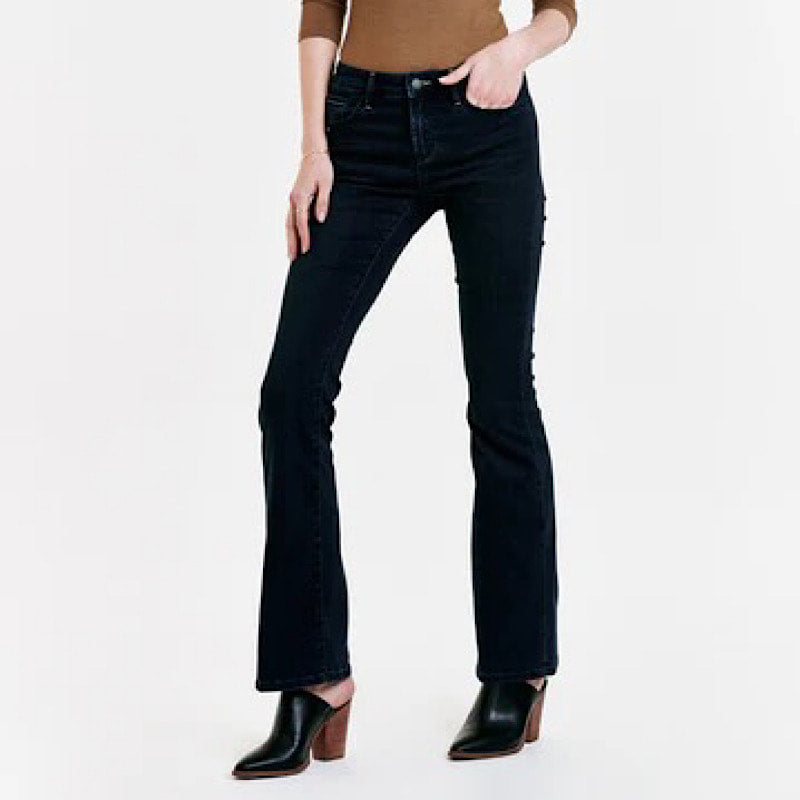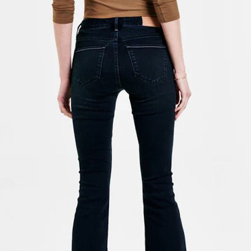 High rise bootcut jeans. It's the spirited fit that sits slightly lower on the waist and fits skinny in the hips and thigh. Full inseam on black weft super stretch denim in rich indigo shade accented with hand sanding hip whiskers, contrast stitching at back pocket hem & button opening, tailored press center seam lines.