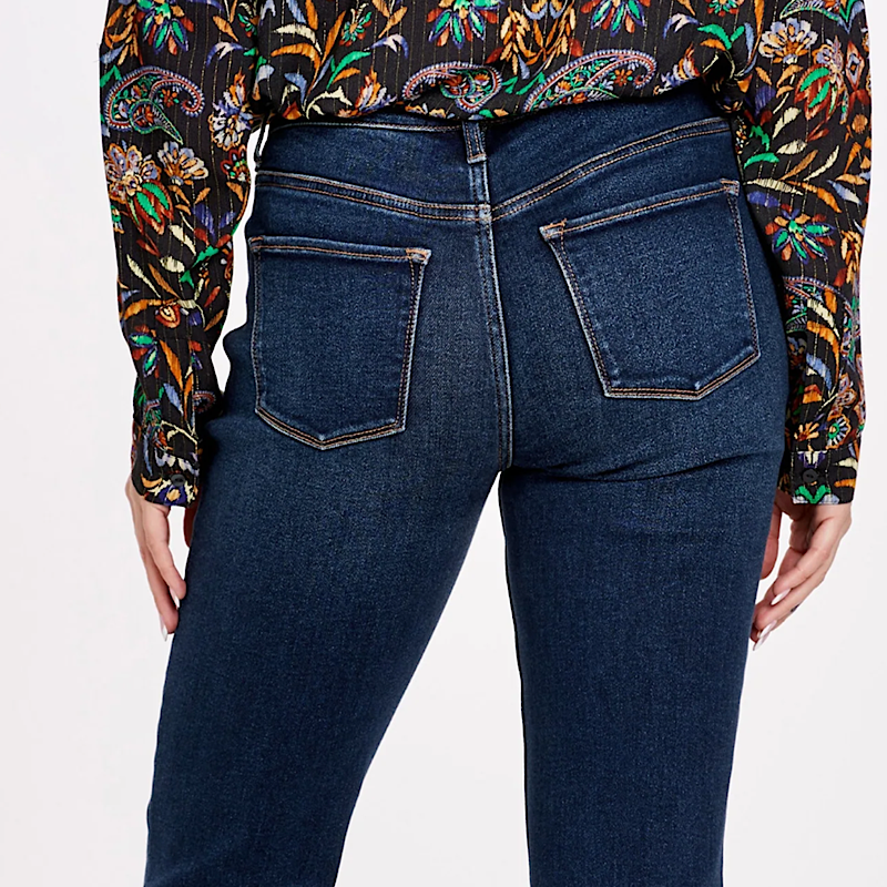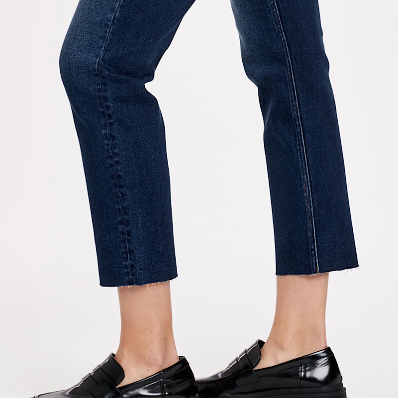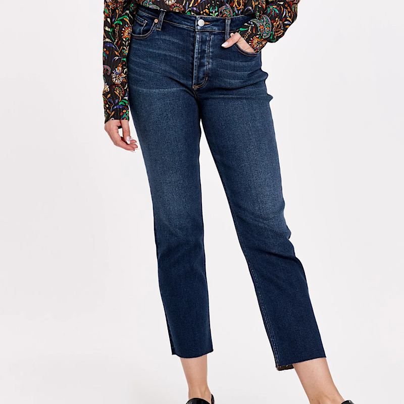 Super high rise cropped straight leg jeans. It's the friendly fit that sits at natural waist and fitted slender from the hip to mid thigh. Cropped inseam on comfort stretch denim accented with hand sanding hip whiskers, cut-off hem details, washed in perfect shade & buttery soft feel.