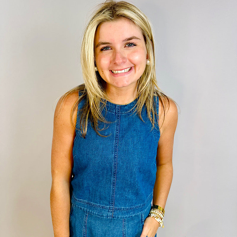 This top takes simplicity to heart. A clean, high neck shell tank with some light denim seam details to keep things interesting. We also gave it a long denim pull on the back for easy zipping. When you wear it as a set with the Allison Pleated Trouser or the Lainey Denim Midi Skirt? Flawless.