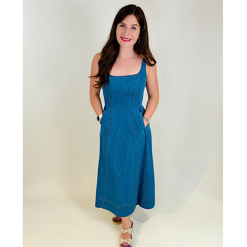 The kind of denim dress that mysteriously works for everything. Backyard BBQs? Yep. Weddings? Weirdly, also yes. With a soft square neckline, flattering princess seams, and hidden pockets (because we care), this one’s on heavy rotation.