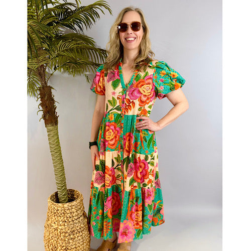 Boho floral mixed pattern midi dress with open collar