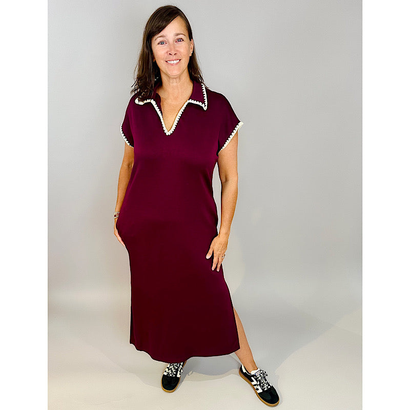 Solid jersey spread collar short sleeve side slit pullover midi dress featuring blanket stitch detail. Side Pockets. Unlined. Knit. Non-sheer. Lightweight.