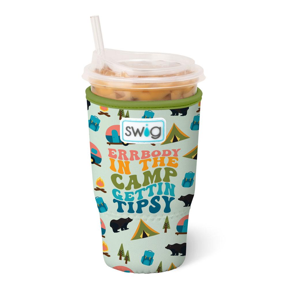 Cool drinks, dry hands! 🧊☕ Errbody this summer is getting tipsy with Swig! 🍹 This drinking buddy design comes party ready with tents, bears, and campers on a pale green background.