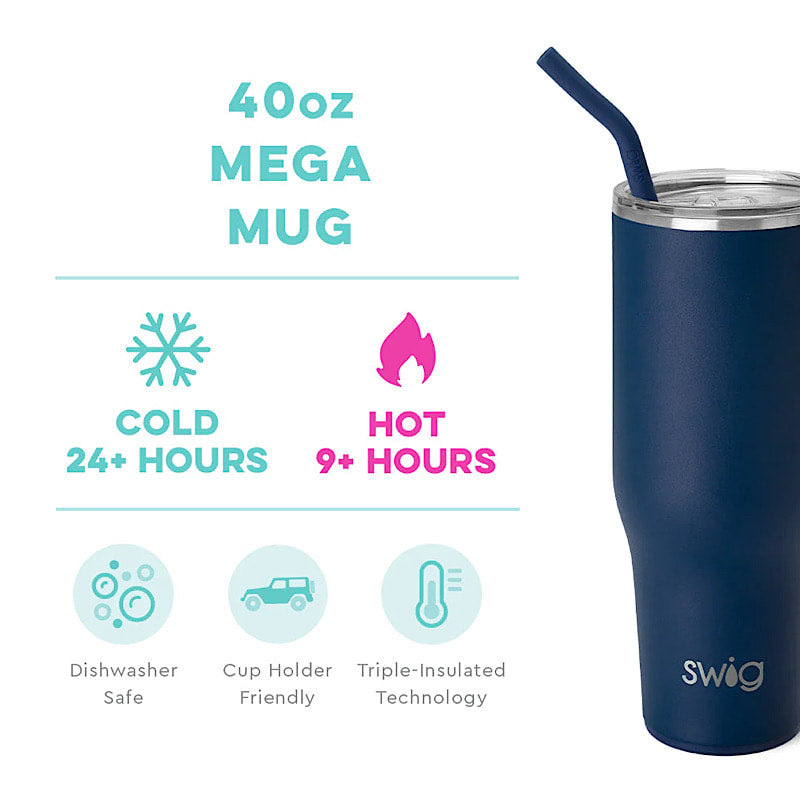 Hydrating has never been easier with our 40oz Mega Mug! The cup holder friendly frame, comfort-grip handle and flexi-tip straw with a standard plastic straw base come together to create your new favorite Swig!