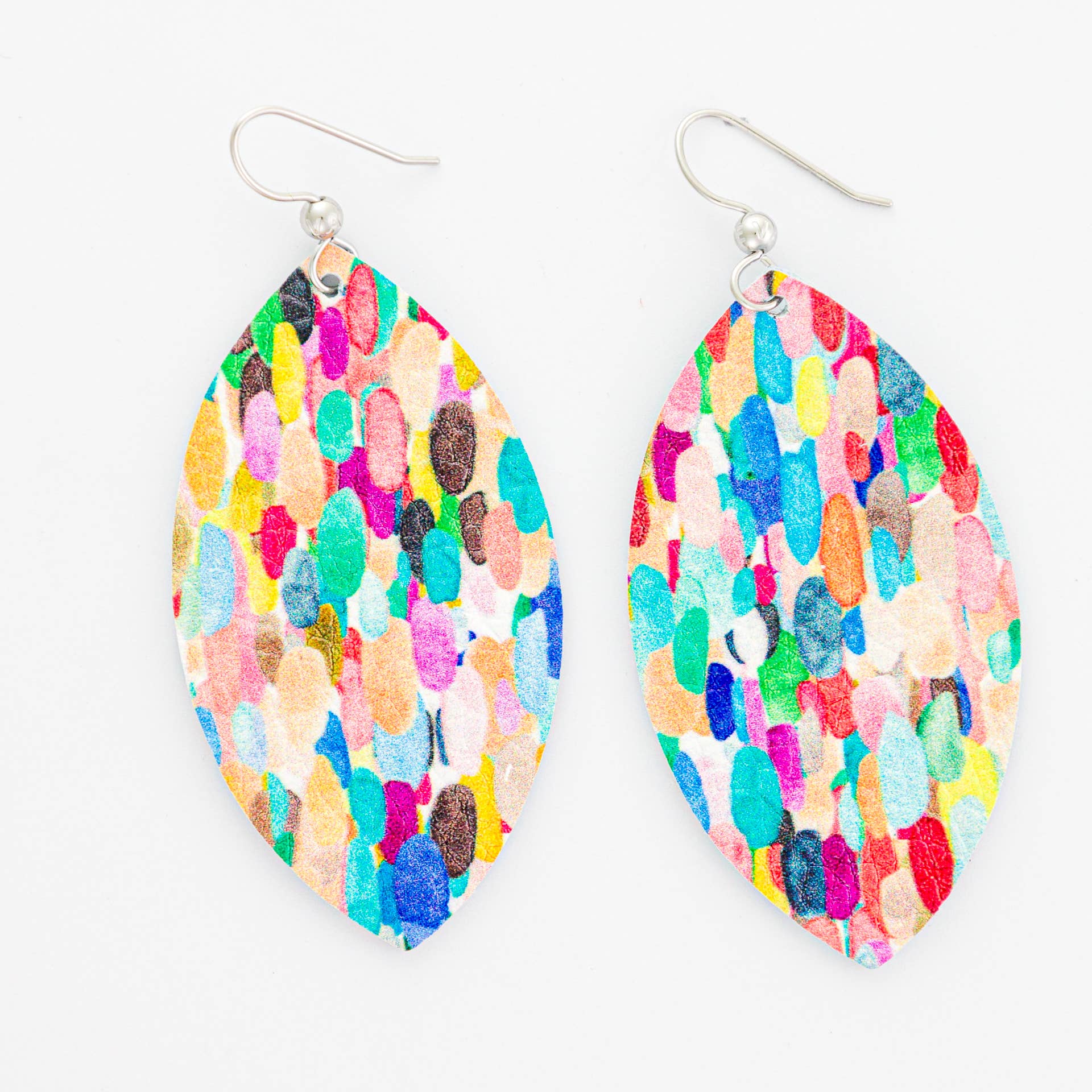 We started our business with a simple idea: design lightweight, statement earrings that women love to wear. Give your customers that pop of color they've been looking for. Our Funfetti leather earrings turn up the party on your ears. It's a nod to stained glass, a mosaic, and colorful brush strokes all wrapped into one.