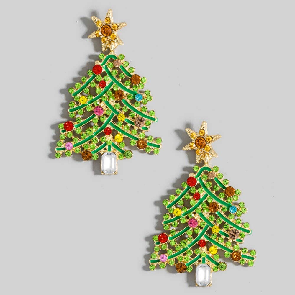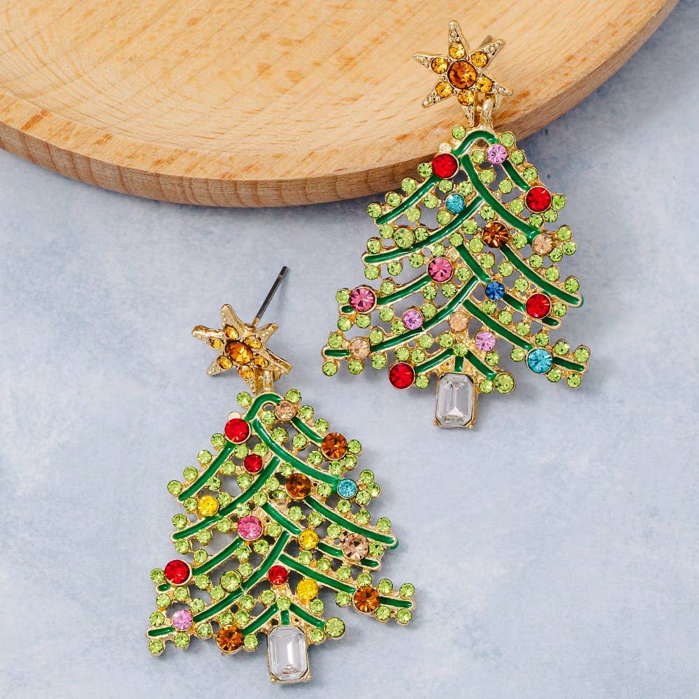 This pair of dangle earrings showcases a unique vibrant studded holiday christmas tree style. Savor the craftsmanship that goes beyond the ordinary, as this pair of dangle earrings effortlessly captivates attention.