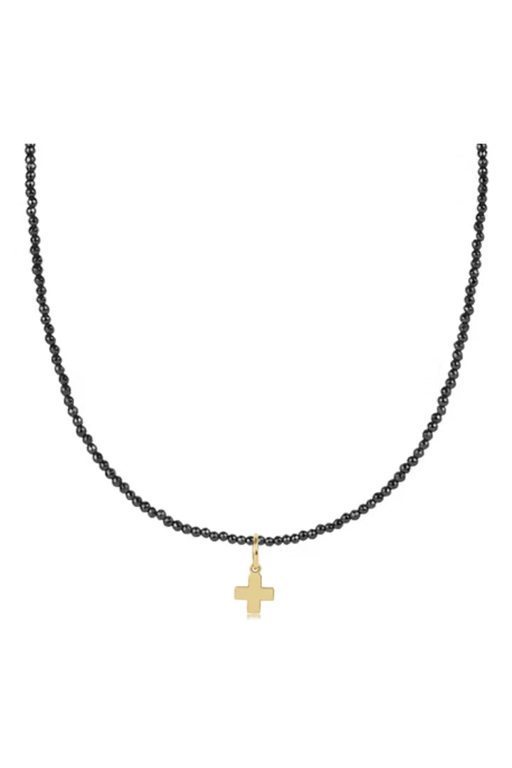 Faceted Hematite Choker 2mm Gold Cross Charm 17"