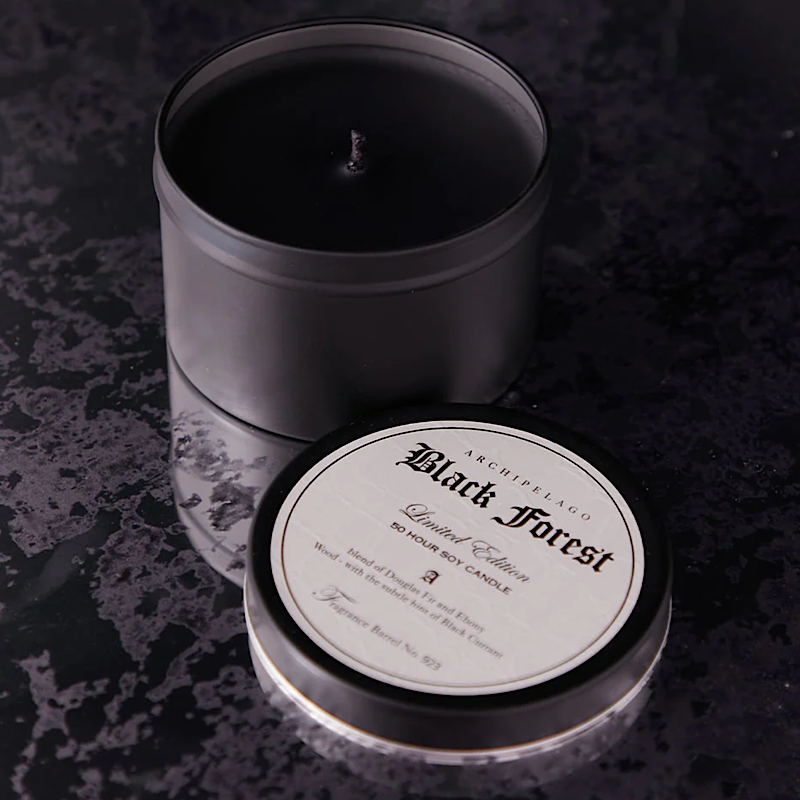 The Black Forest Travel Tin Candle comes in a dramatic matte black container that can easily slip into your suitcase or be used as an elegant addition to your home decor. We blend our Black Forest fragrance in small batches and leave the oils to age in barrels. This process allows them to blend, mature, and intensify into a fragrance that is sultry and smooth.