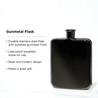 Curious how even the best liquor tastes better from a bright metallic flask. Plated in brazen gunmetal black, each polished six-ounce vessel is liquid-tight and crowned with a weighty, equally lustrous cap to hold any desired liquor.