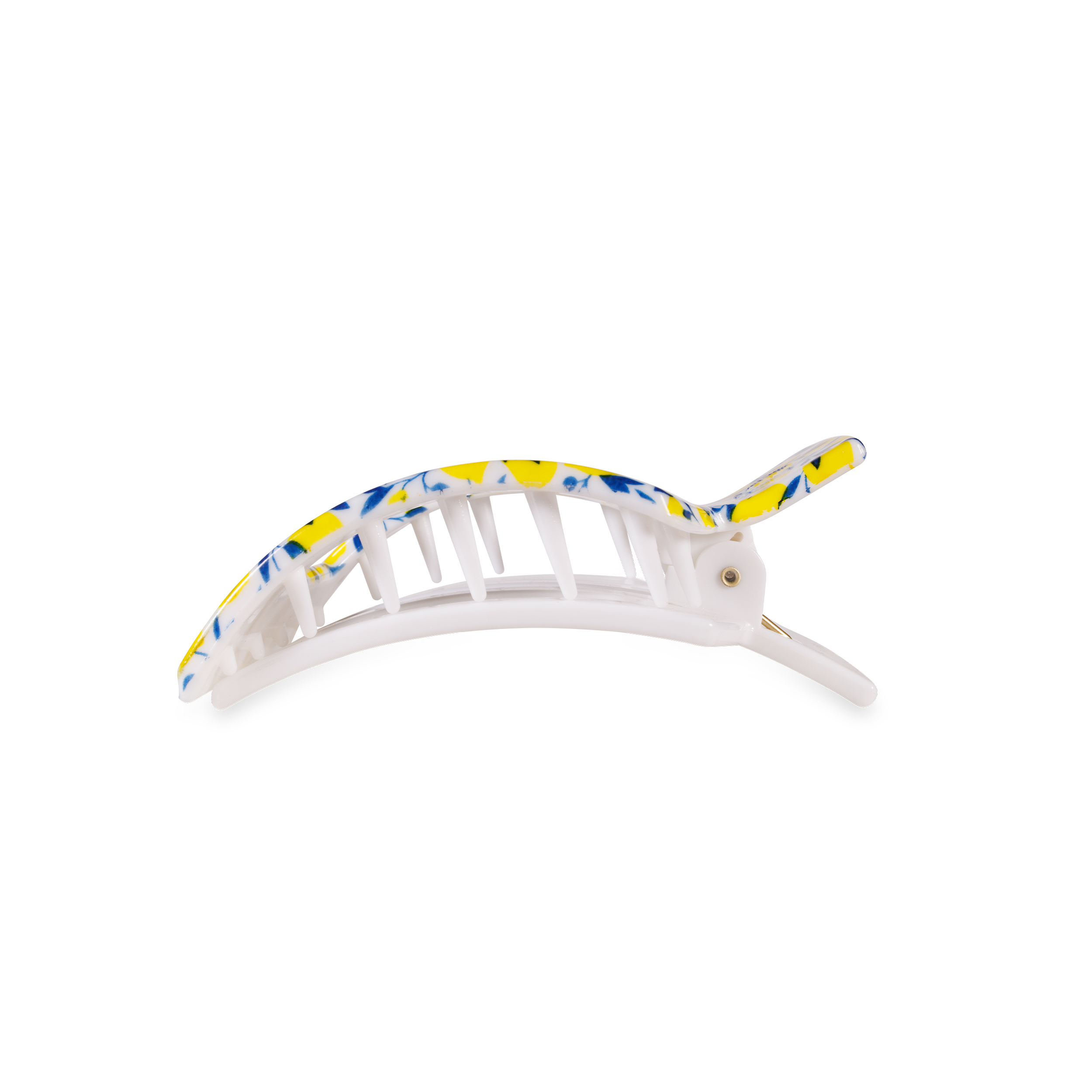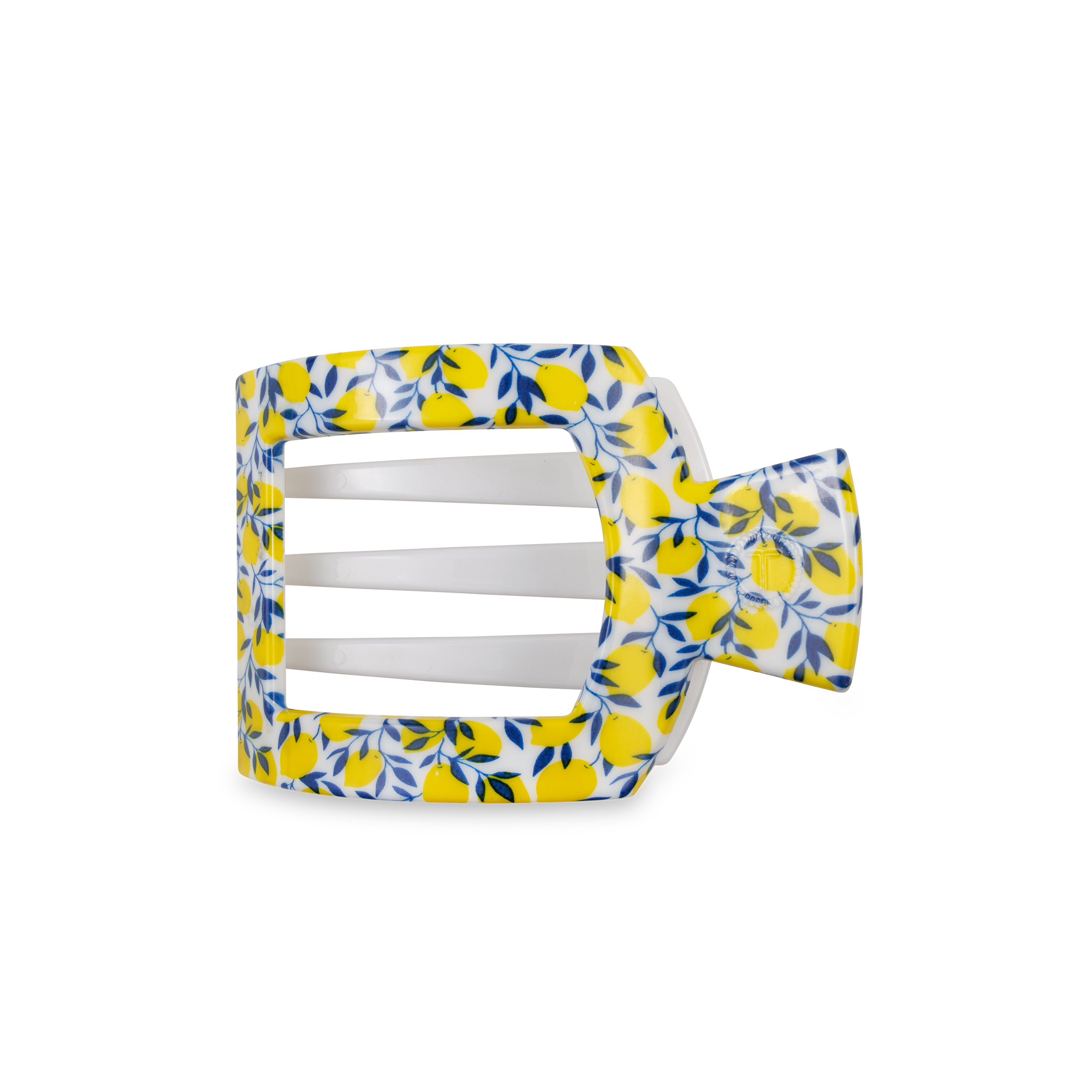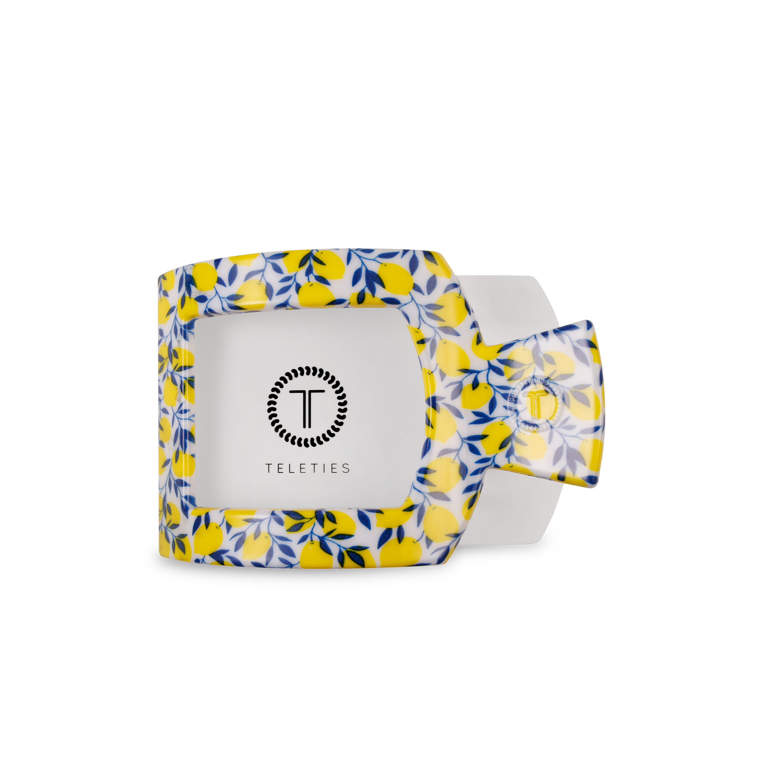 Lay flat and relax with the new TELETIES Limoncello Flat Square Hair Clip with a bold lemon print in yellow and blue. This hair clip is designed to allow you to lay back flat, do yoga, or sit comfortably in a seat with a headrest, and it is made with the same material that is nearly unbreakable.