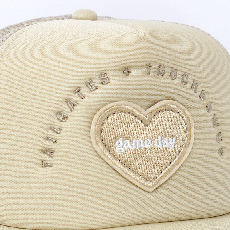 Take your game day look to the next level with this adorable trucker hat! Featuring a mesh adjustable back and embroidered heart detail, it's easy to show your team spirit in effortless style. With 8 colors to choose from, you can always root for your team!