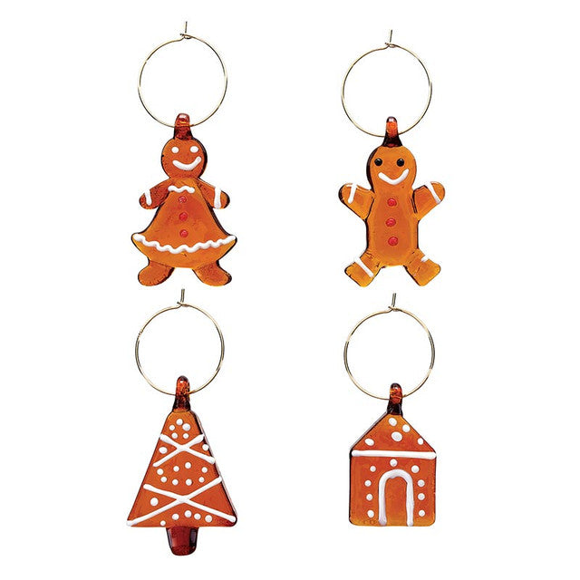 Celebrate the season with our Gingerbread Icon Wine Charms! This handcrafted set of four-featuring a gingerbread boy, girl, tree, and house-is made from borosilicate glass with a hand-painted finish. A festive and functional touch for holiday entertaining!