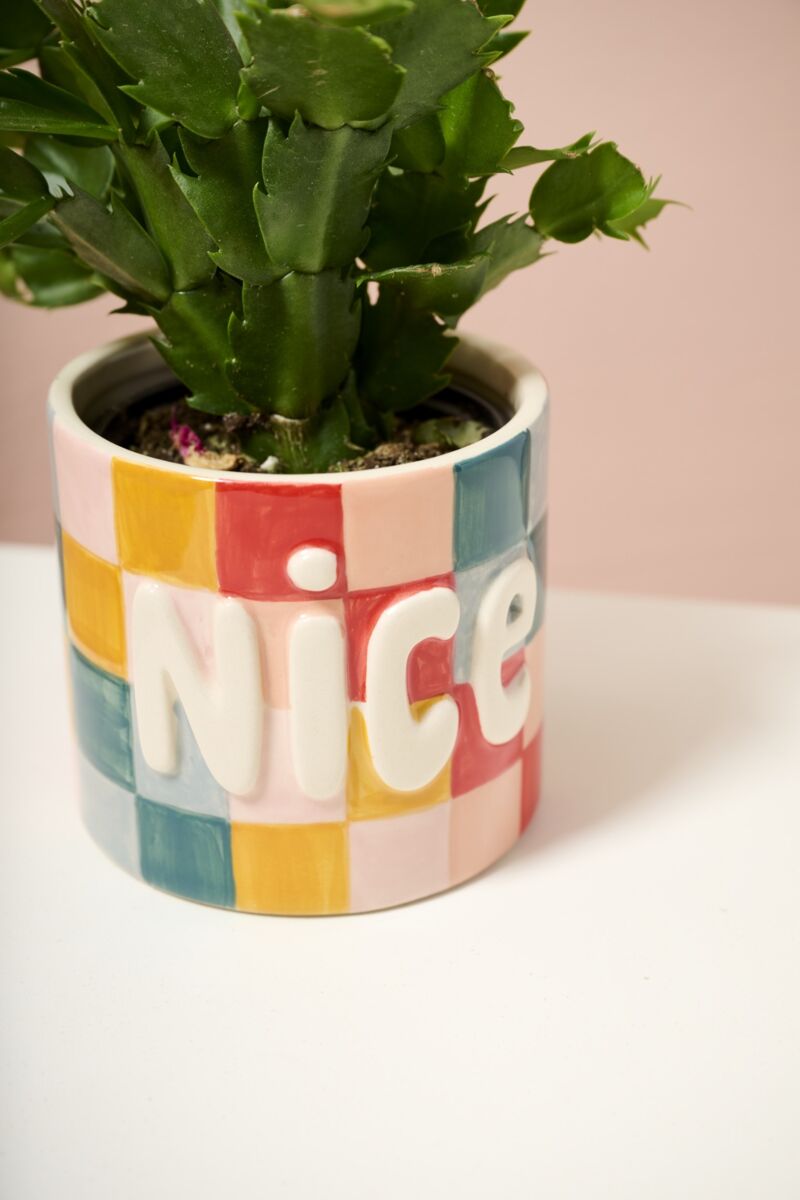 Everyone is a little naughty & nice, which makes this pot the perfect holiday gift. This trendy multicolored checkerboard pot features a gloss finish & dimensional lettering on front & back with two words "Naughty" & "Nice." Turn either way to show how you feel any given day (but turn back to "Nice" when Santa comes!) Pair with a 4-inch drop-in plant for a cheeky festive gift to make someone smile.