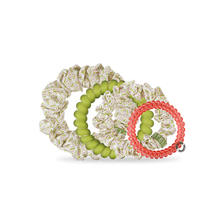 Pine & Pearl Mix Pack Hair Ties in Green, Red, and White offer a strong grip without damage, doubling as a stylish bracelet when not in use. The TELETIES x Laura Park Holiday Collaboration features bold, playful designs that combine Laura’s vibrant art with TELETIES signature function.