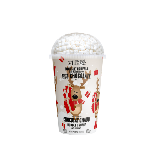 Reindeer Gift cup filled with our Double Truffle Hot Chocolate blend. The packaging has been completely redesigned for this season. More decorative and more environmentally friendly. Recyclable cardboard cup now features a decorative theme wrapped all around, more fun to sip and enjoy. Each is filled with a matching pouch of our finest Hot Chocolate mix and is topped off with a dome filled with mini dehydrated marshmallows, enough to top off many cups of your favorite Hot Chocolate. 58 g (2 oz)