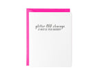 Our "Glitter and Cleavage" birthday card is letter pressed by hand on an antique press. It is printed with black ink on thick, brilliant white 100% tree-free cotton paper. It is paired with a neon pink envelope.