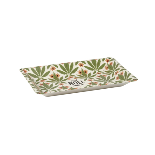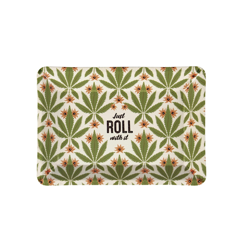Give anyone that steps into personal space a vibe check with this down-to-earth vanity tray. Our durable metal vanity tray displays a relaxing pot leaf pattern accented with a chill sentiment that reads "Just Roll With It" all in an earthy color palette. Questionables everyday vanity tray is perfect for holding daily items or as a rolling tray during a chillsesh. Our Roll With It vanity tray is designed to maximize chill at home or for gifting to pass that feeling to someone who needs it.