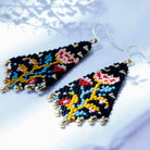 These drop earrings feature a striking and original floral design made from handwoven glass beads sewn together one bead at a time. The background color contrasts perfectly with the flower/leaf design to bring these night blooms to life. Accenting the bottom of the earring are gold drop beads which give the earrings an elegant touch. The beaded portion of the earring is hung from a 14K hypoallergenic gold plated ear wire.