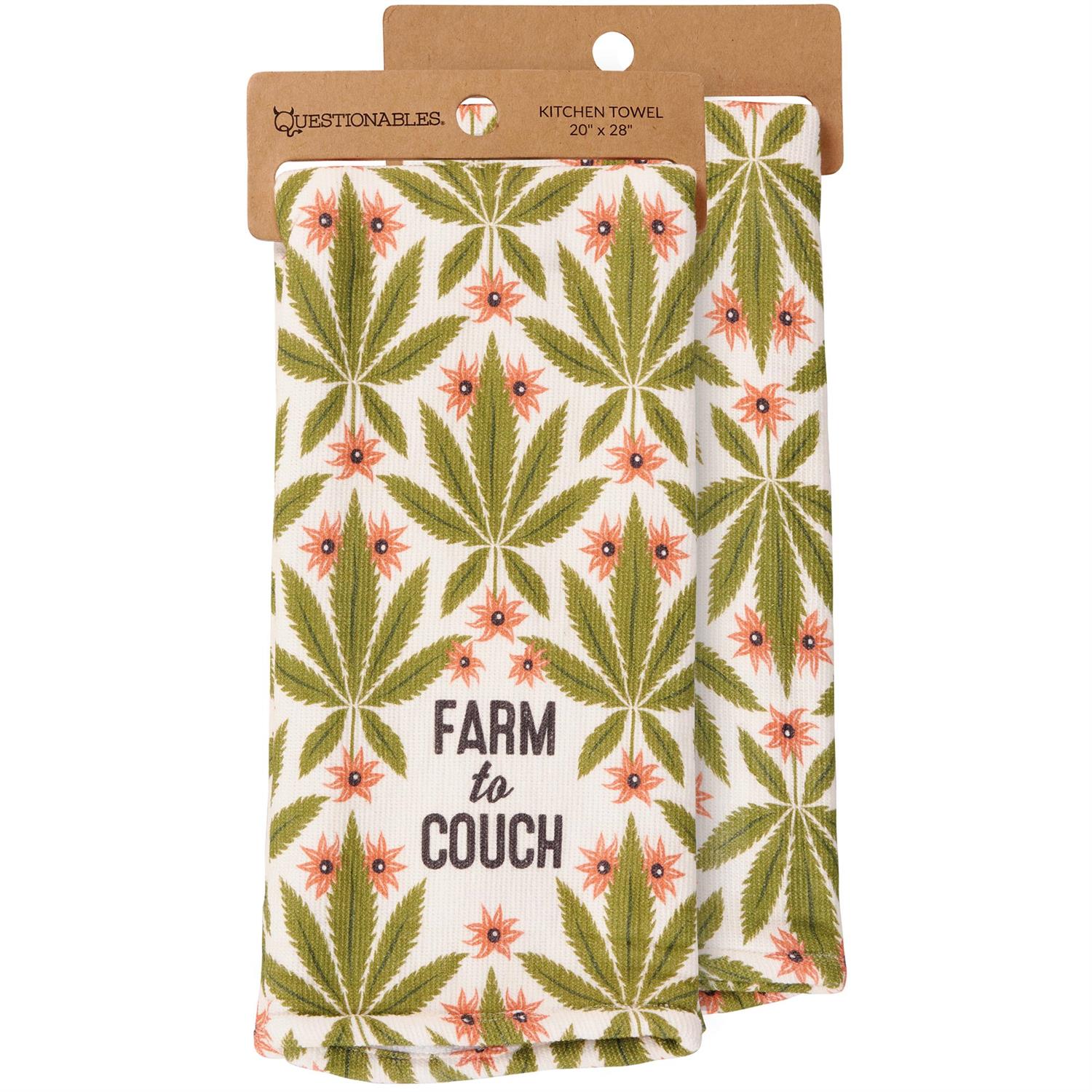 Give anyone that steps into personal space a vibe check with this super-soft cotton kitchen towel displaying a relaxing pot leaf pattern with a chill sentiment that reads "Farm To Couch." Fold to display the chill pattern or flip for the relatable sentiment. Questionables kitchen towel features an absorbent terrycloth layer on the back to soak up whatever you throw at it. Machine-washable for stress-free cleaning. Packaged on a cardboard hanger with a hole to beautifully display on rack. Our Farm To Couch kitchen towel is designed to maximize chill at home or for gifting to pass that feeling to someone who needs it.